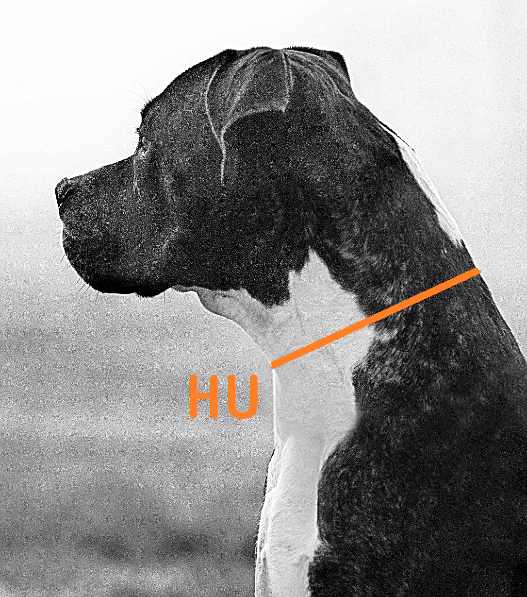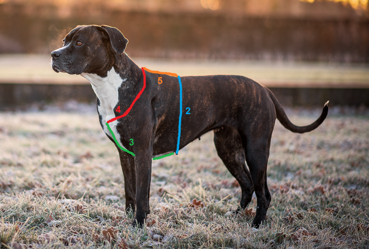 - gemessen wird ab dem obersten Punkt des Brustbeins, zwischen den Vorderbeinen entlang bis dort, wo der Brustumfang gemessen wurde